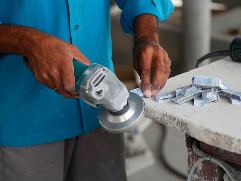La coupe manuelle dépend fortement de l'habileté et de l'expérience humaine. Les travailleurs utilisent des outils comme des coupeurs, des meuleuses et des polisseuses pour façonner la pierre.