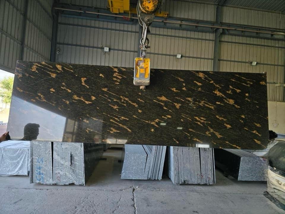 This granite is commonly used in luxury staircases, kitchen countertops, lobby flooring, and interior elevation work, especially where clients want the signature look of Fish Black Granite with golden accents.