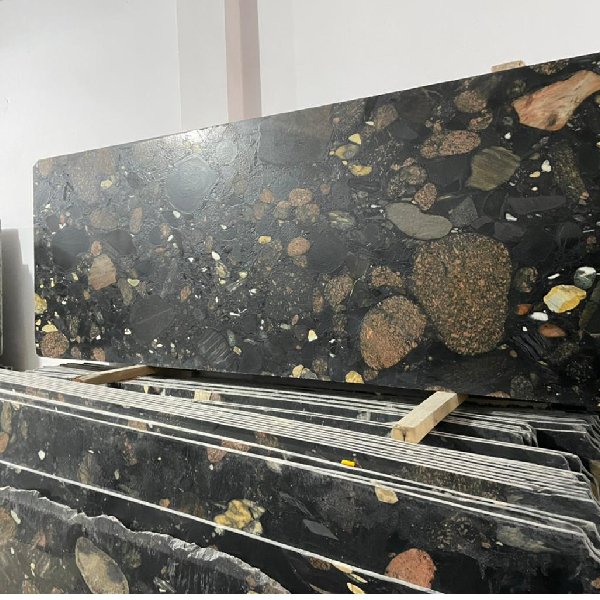 Certain finishes enhance the three-dimensional quality of the embedded stones, creating a luxurious and eye-catching surface. The pebbles are smooth and seamlessly integrated into the black matrix, providing a unique look and feel.