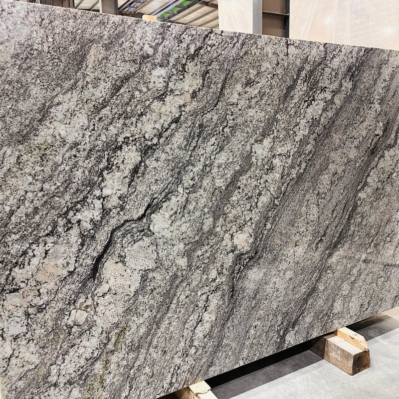 Armani Grey Granite is a high-feldspar Indian granite known for its dramatic veining and diagonal flow pattern, featuring shades of grey, silver, and taupe — perfect for stylish indoor installations.